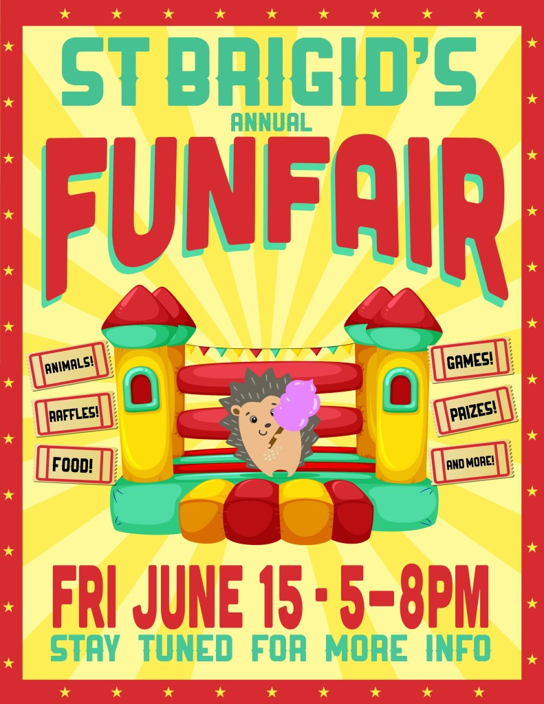 – BAKE SALE – Are you a master baker, or do you have a fun, simple PEANUT-FREE recipe you could put together for the day of the Fair? IF so, please email stbrigidcsac@gmail.com and we will put you in touch with Michelle Holder.