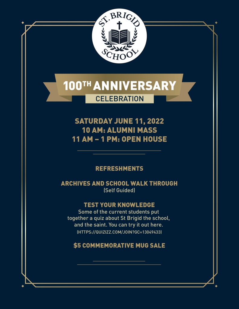 This SATURDAY, JUNE 11th, there will be an alumni mass and open house in honour of St Brigid’s 100th anniversary. Please come and celebrate! Cake/coffee will be available, along with a limited supply of commemorative 100th anniversary mugs and freezies (cash only!). Please RSVP here if you hadn’t already.